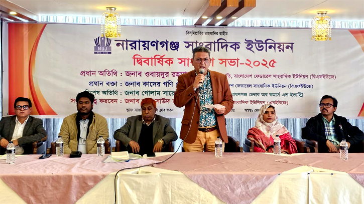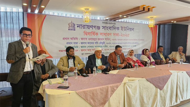 নারায়ণগঞ্জ সাংবাদিক ইউনিয়নের দ্বিবার্ষিক সাধারণ সভা-২০২৫ শনিবার (২৭ ডিসেম্বর) উৎসবমুখর পরিবেশে অনুষ্ঠিত হয়েছে। সভায় প্রধান অতিথি হিসেবে উপস্থিত ছিলেন বাংলাদেশ ফেডারেল সাংবাদিক ইউনিয়ন (বিএফইউজে) সভাপতি ওবায়দুর রহমান শাহিন। সাংবাদিক বিল্লাল হোসেন রবিনের সঞ্চালনায় অনুষ্ঠানে সভাপতিত্ব করেন নারায়ণগঞ্জ সাংবাদিক ইউনিয়নের সভাপতি আবু সাউদ মাসুদ।