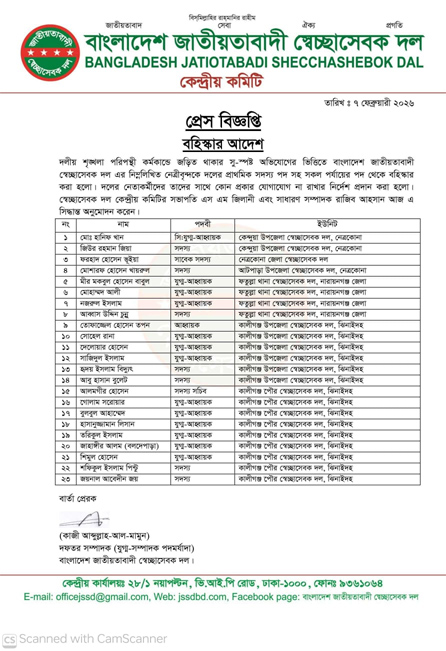 শনিবার বিকেলে কেন্দ্রীয় স্বেচ্ছাসেবক দলের দপ্তর সম্পাদক কাজী আব্দুল্লাহ আল মামুনের স্বাক্ষরিত এক প্রেস বিজ্ঞপ্তিতে এ তথ্য জানানো হয়।
